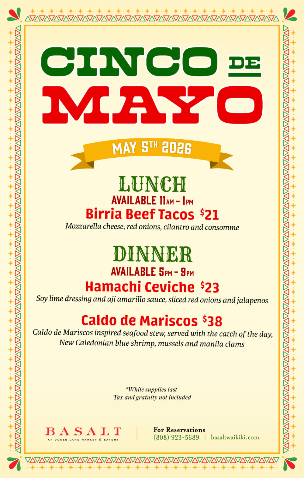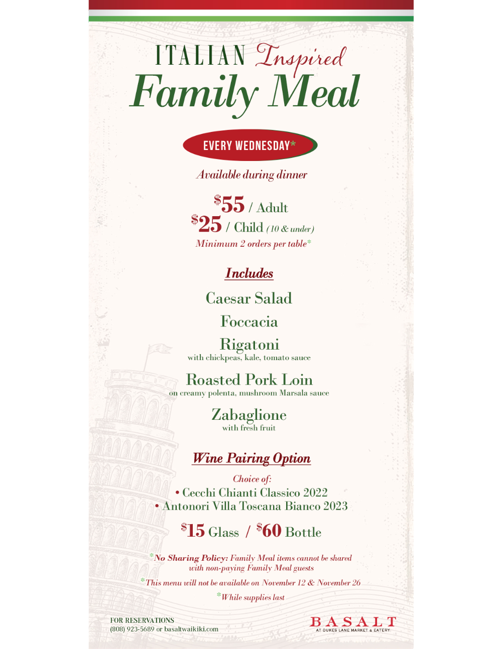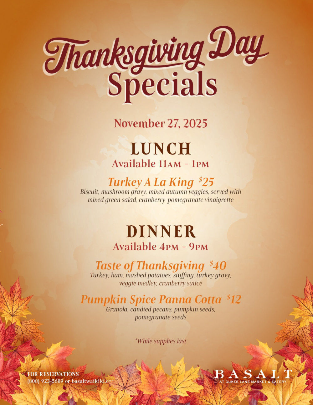 PARKING: Complimentary validation available (self-parking only) for Basalt customers at the Hyatt Centric Waikiki Hotel.